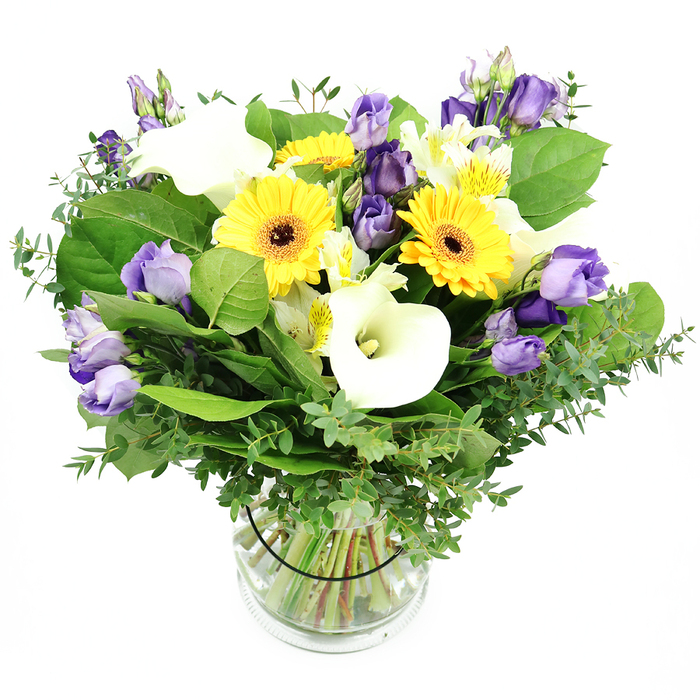 The quickest way to show you care is by sending this flower arrangement made up of gerberas, calla, lisianthus and greenery. Freshly picked flowers full of tenderness and designed with your thoughts in mind.